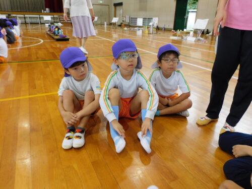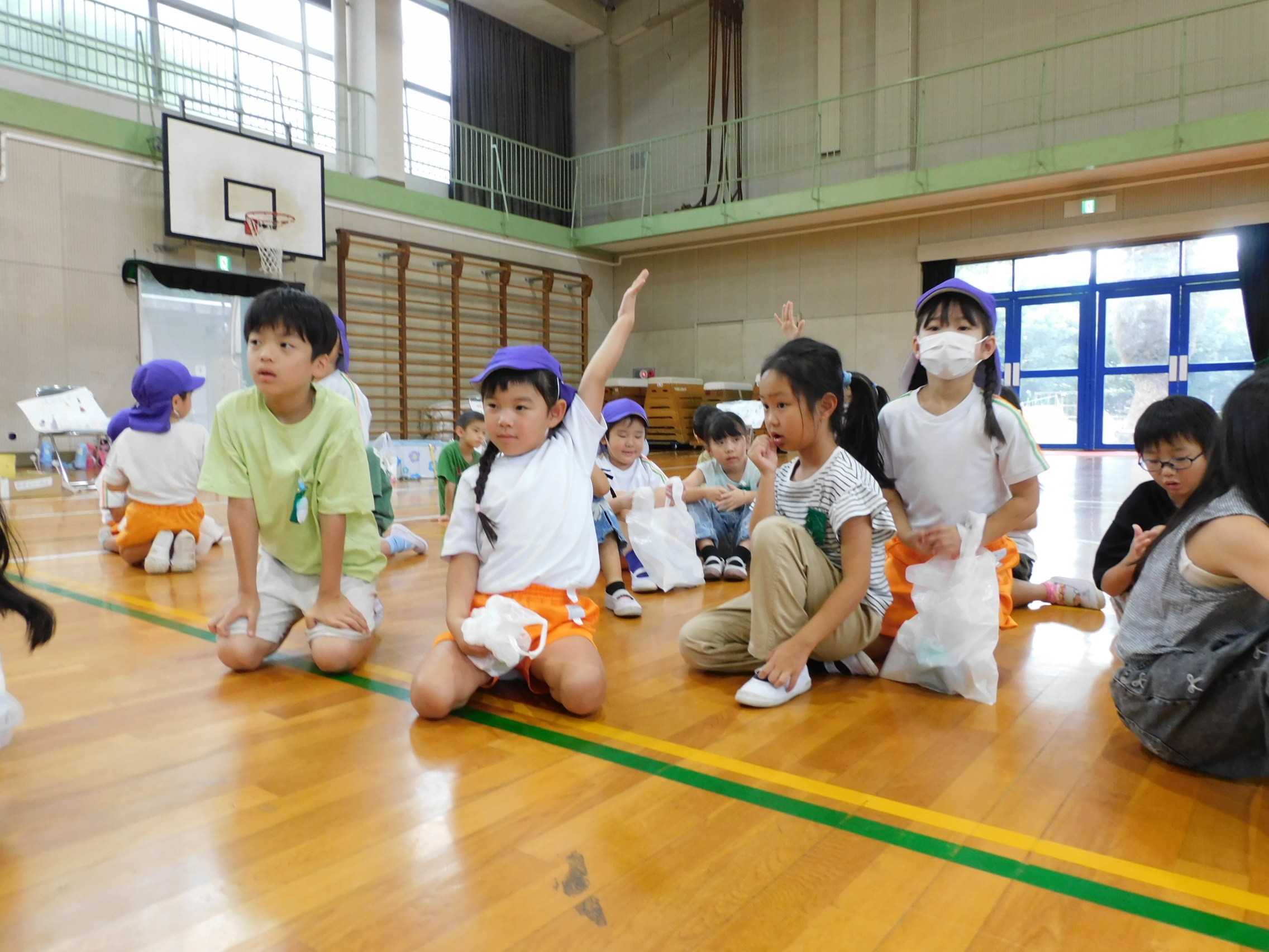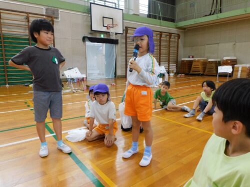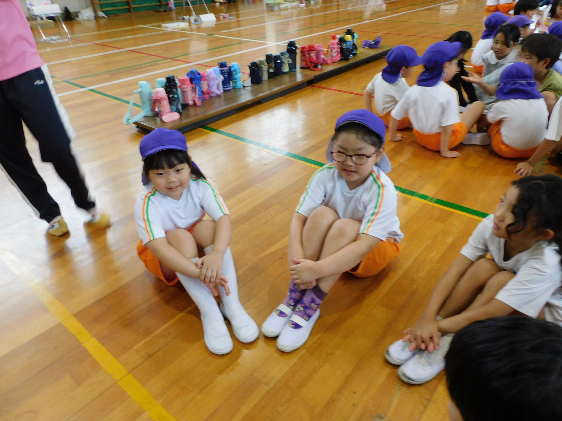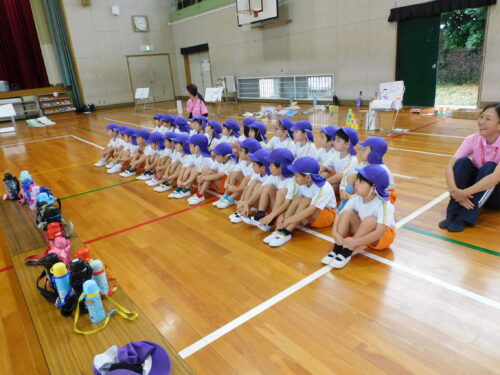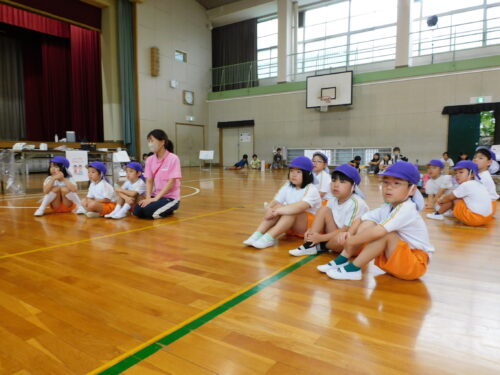 体育館の大きな扉を潜り抜けると、2年生のお兄さんお姉さんと先生方が待っていてくださいました。!ドキドキしながらも「おはようございます!」と大きな声で挨拶することができていましたよ。