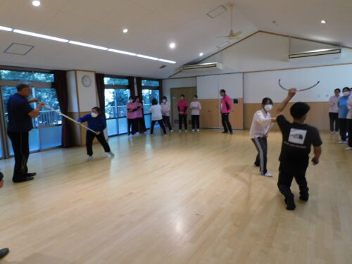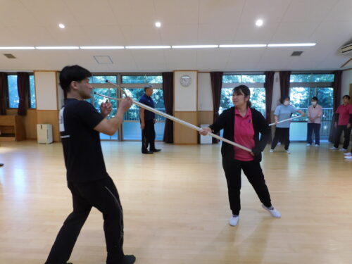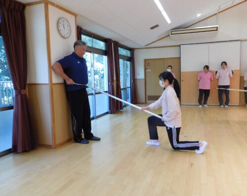 その後は、さすまたの使い方を指導していただきました。持ち方、構え方、使い方によって有効な使えることを学びました。