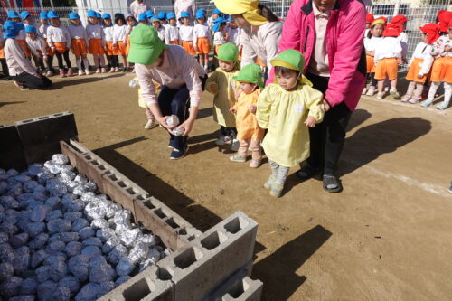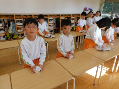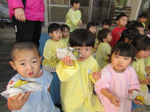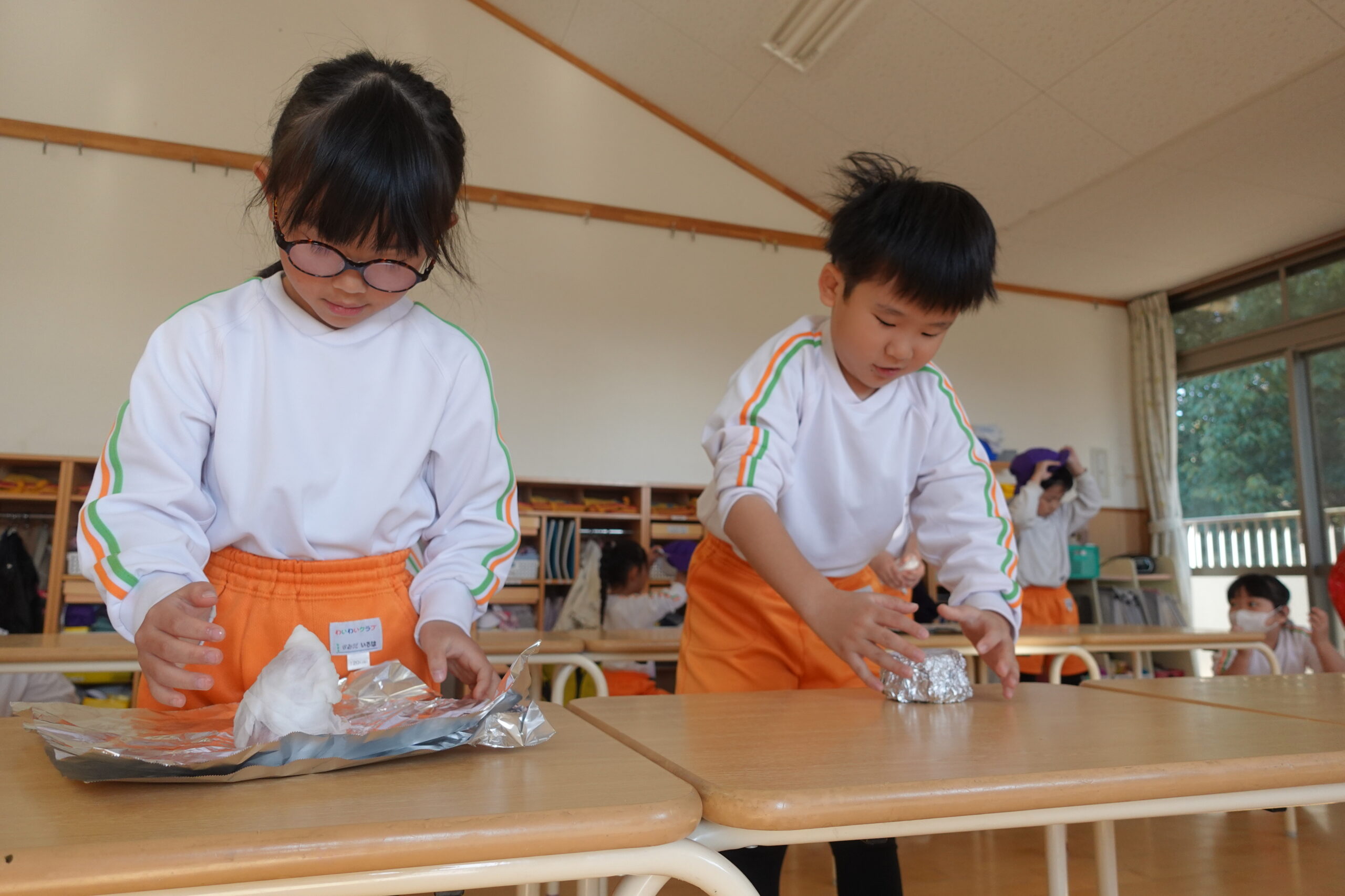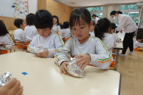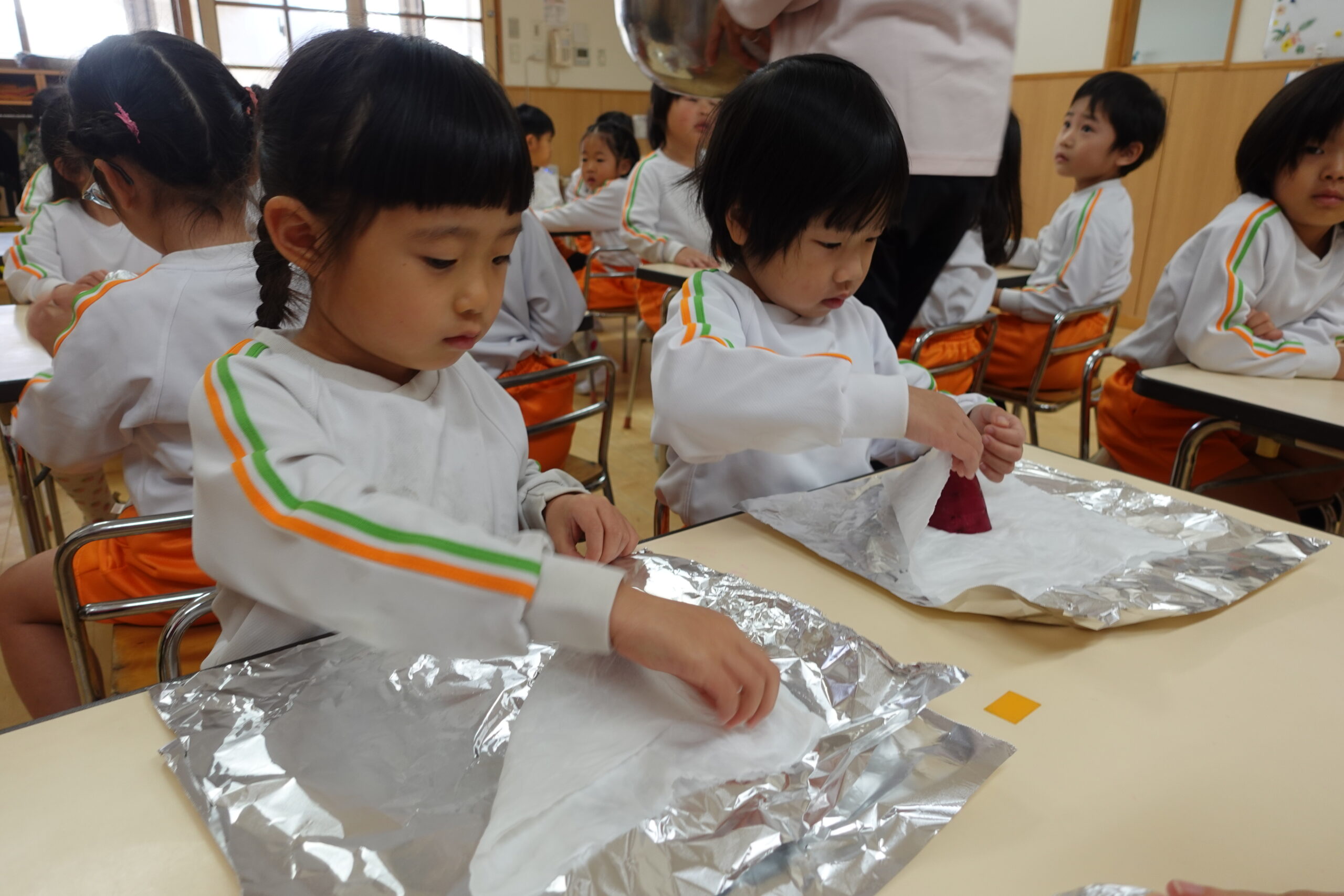3~5歳児のお友だちがおいもを巻いてやきいもの準備をお手伝いしてくれましたよ。