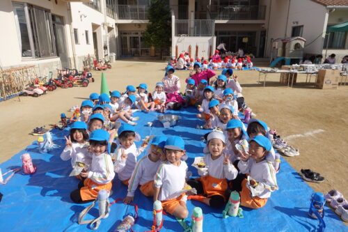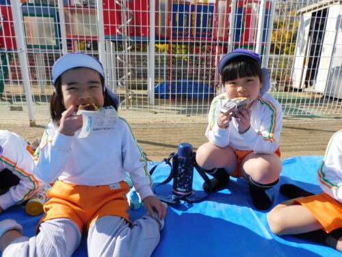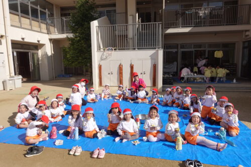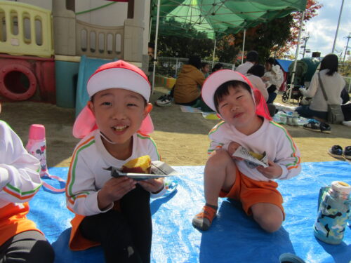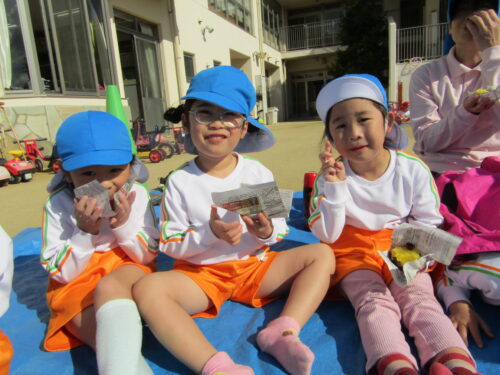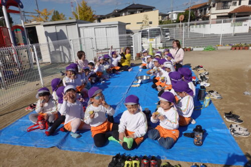 「焼き芋やけたよ~。」の合図でクラスに分かれてシートに座り