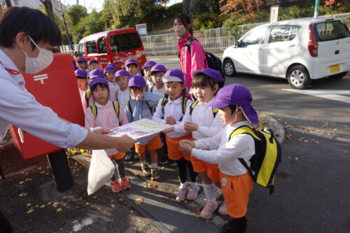 バスに乗って園に帰る前に、郵便局にもカレンダーを渡しに行きました。