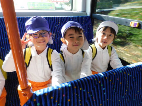 まずはバスに乗って駅まで向かいます。「行ってきまーす。」と園を出発し、