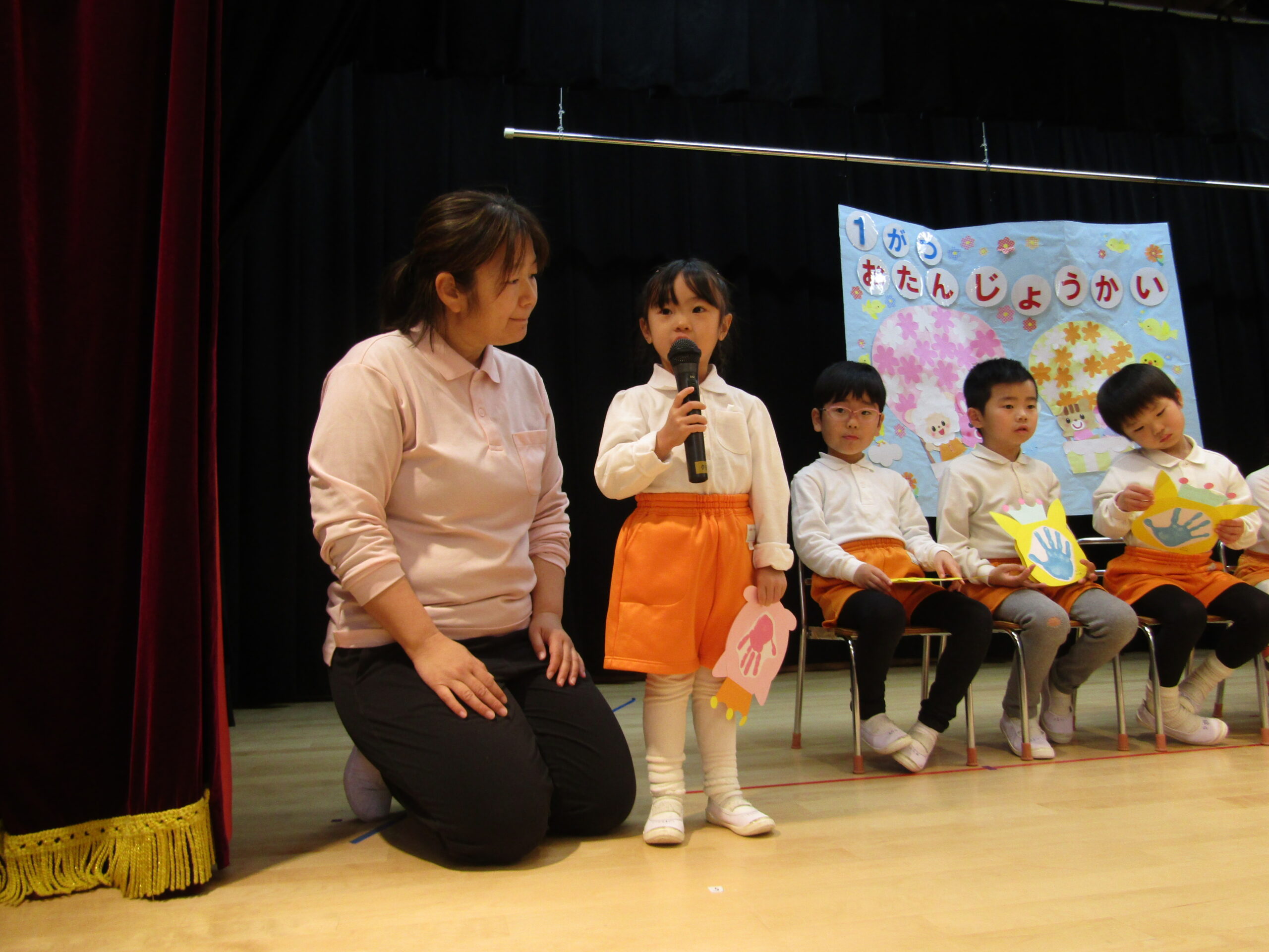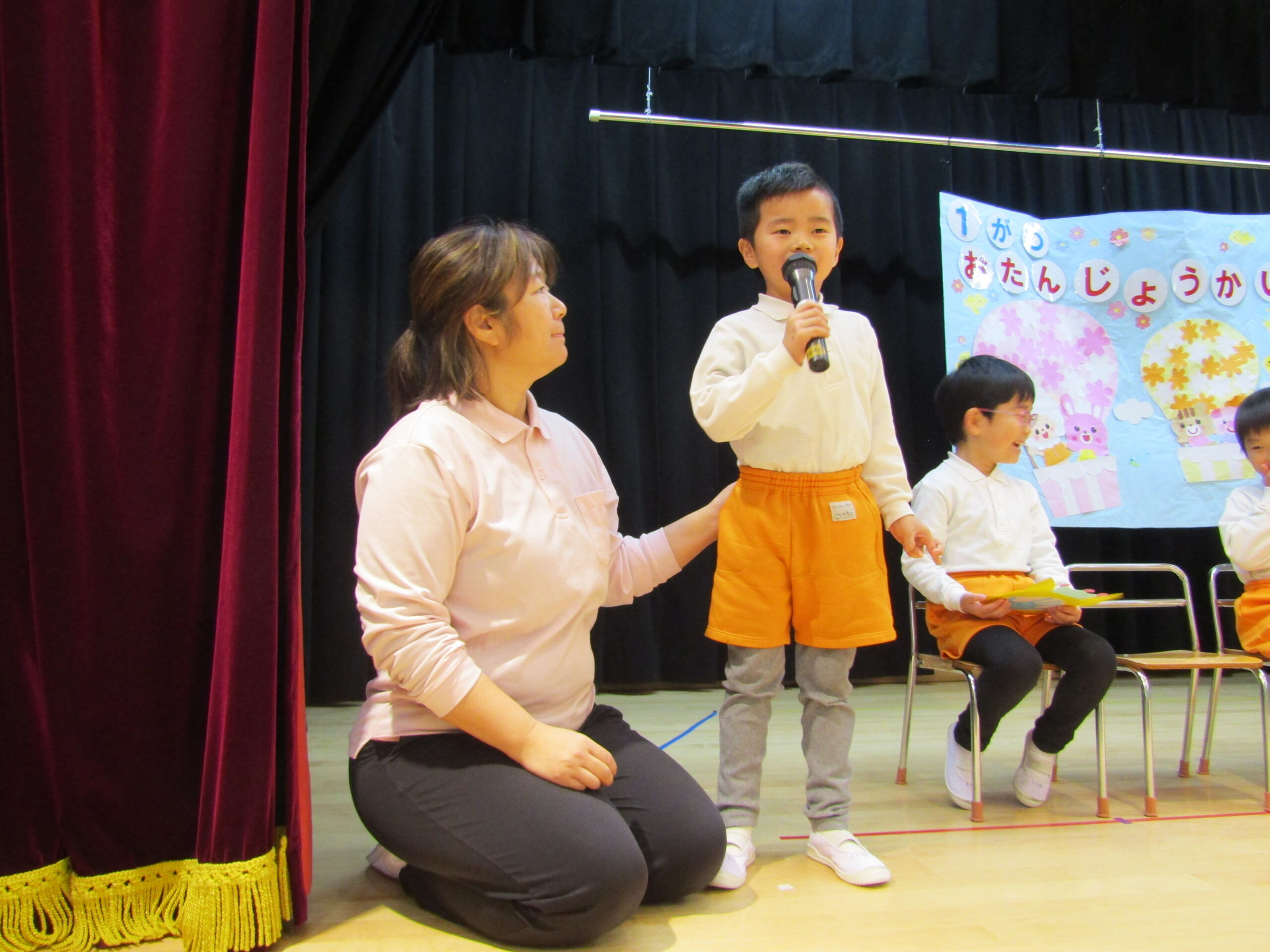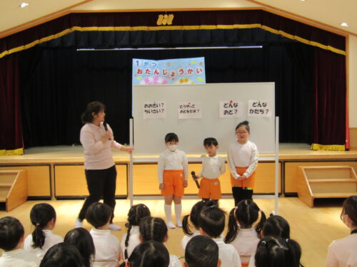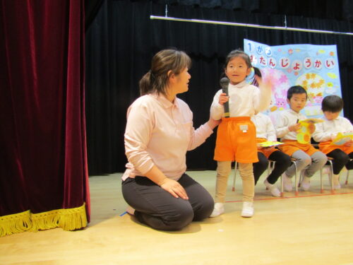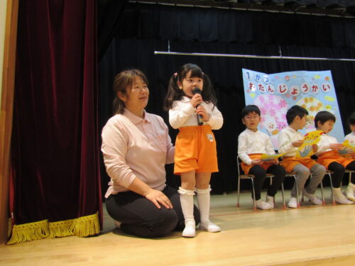 お誕生児の紹介では、年長さん(あやめぐみ)は大きな声で堂々と発表し