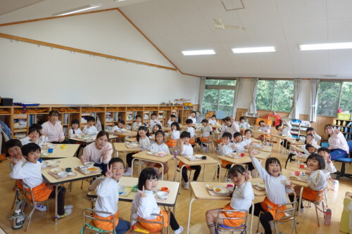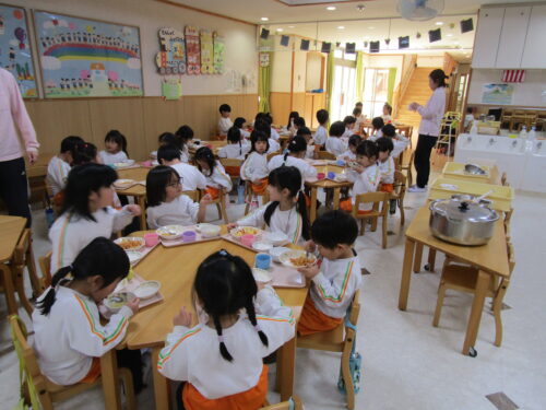 給食はあやめぐみのお友達がほしぐみ・にじぐみ・すみれぐみのクラスに入り、一緒に食べてくれました。初めは少し緊張している様子でしたが、お話を楽しみながら食べていました。何が一番楽しかった?の質問に「ぜーんぶ!」と嬉しい答えが返って来ました。