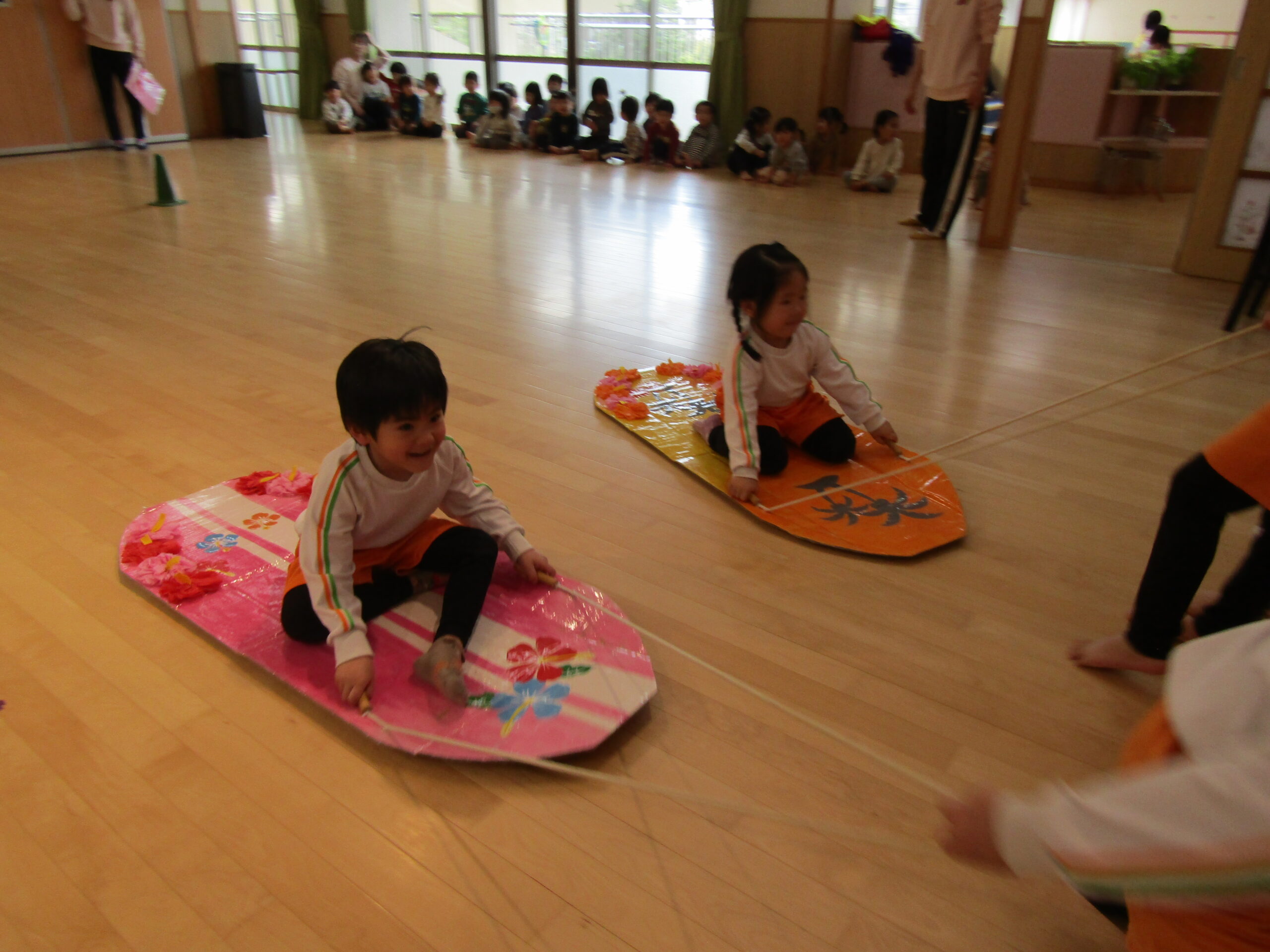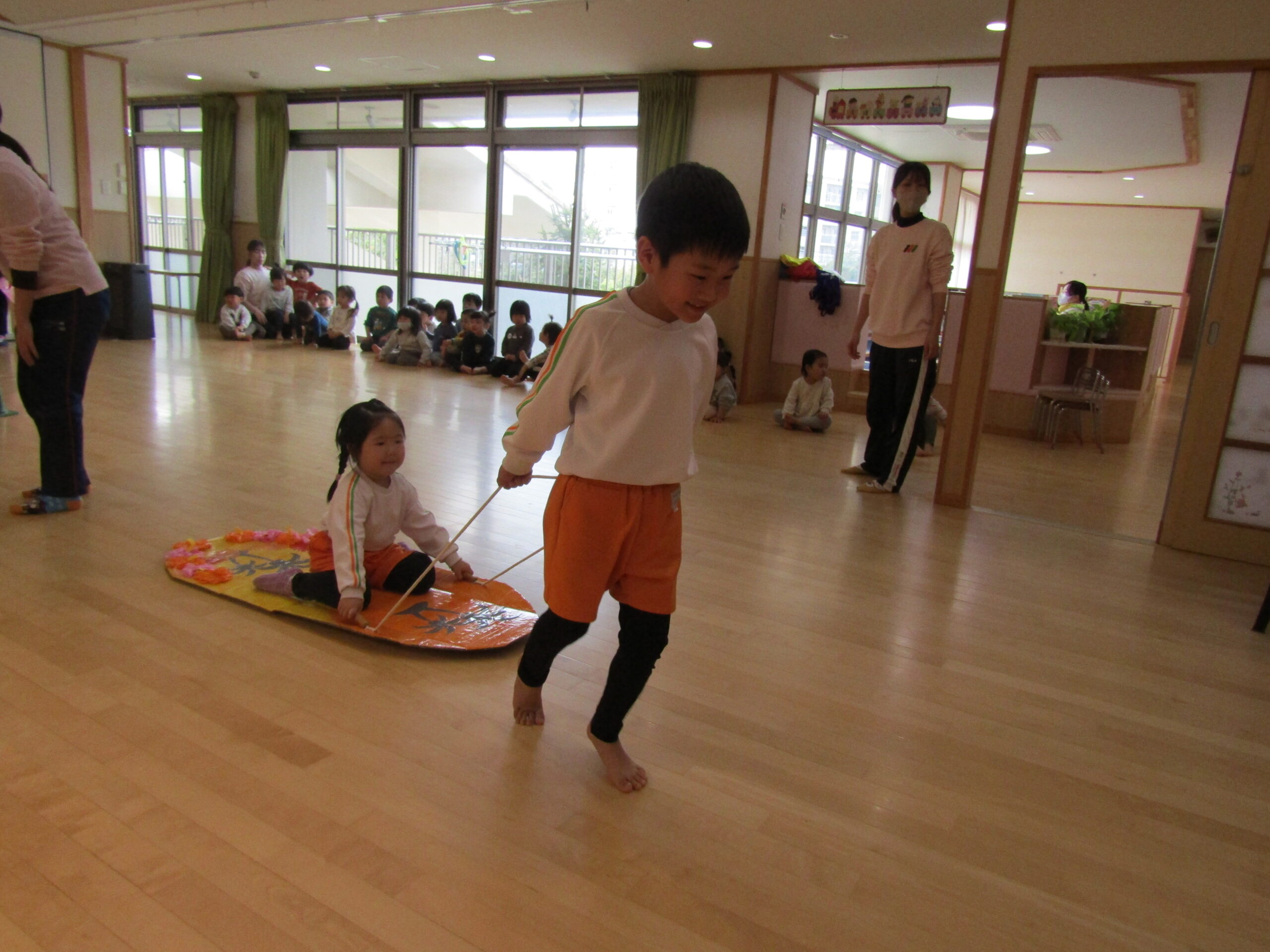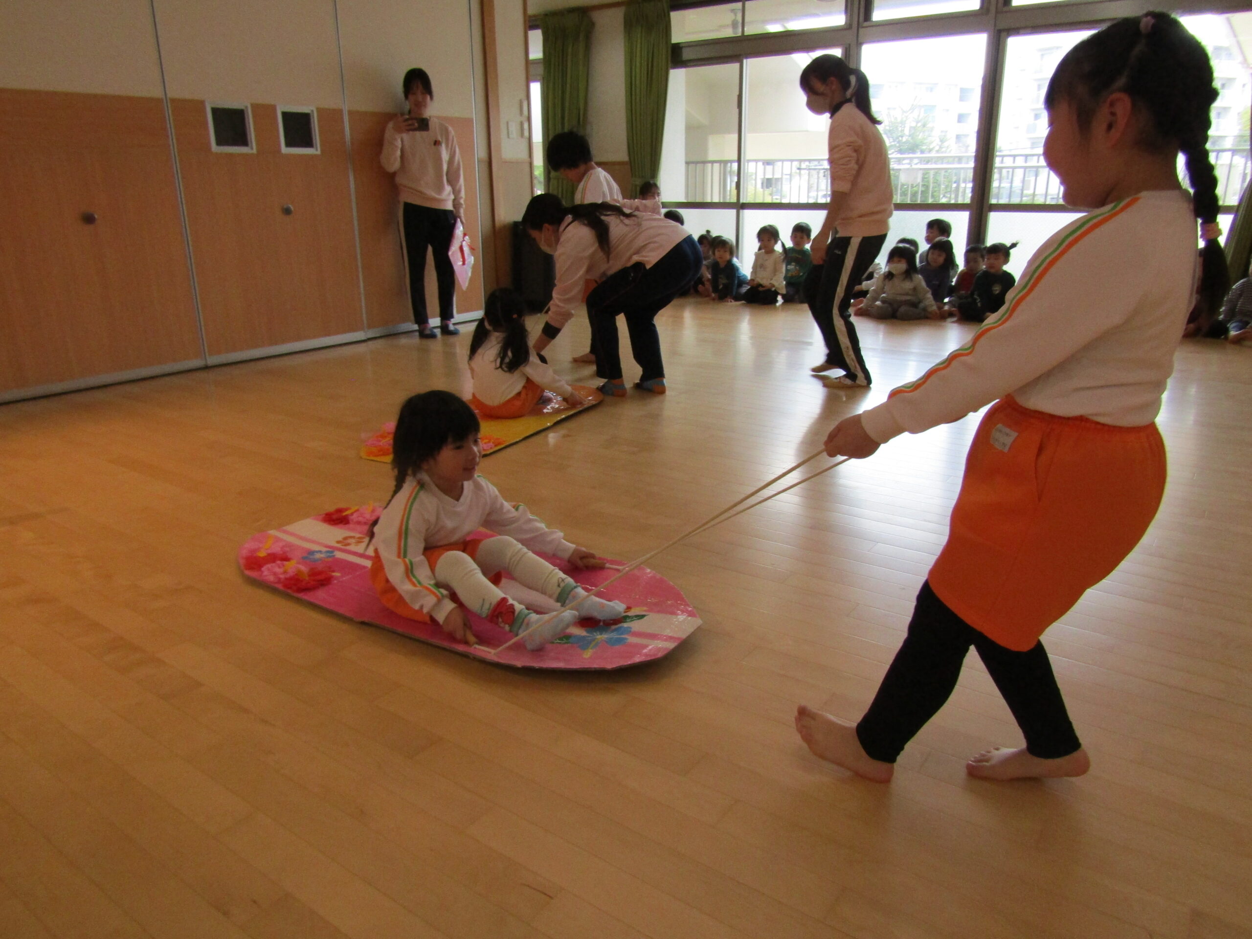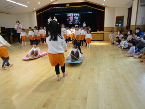 にじぐみのお友達が落ちないようあやめぐみさんが引っ張りました。勢いの良さに大盛り上がり!みんな力持ちでした。