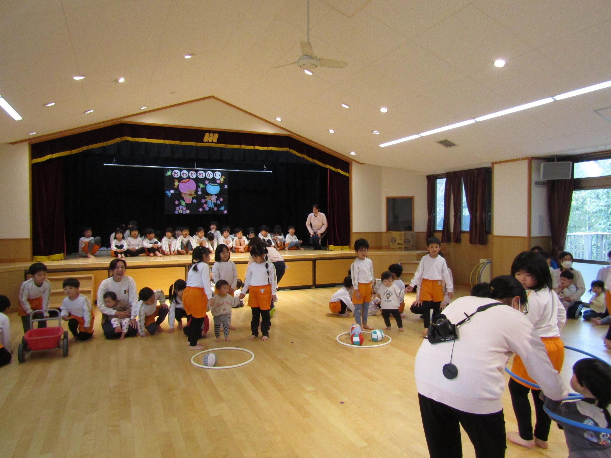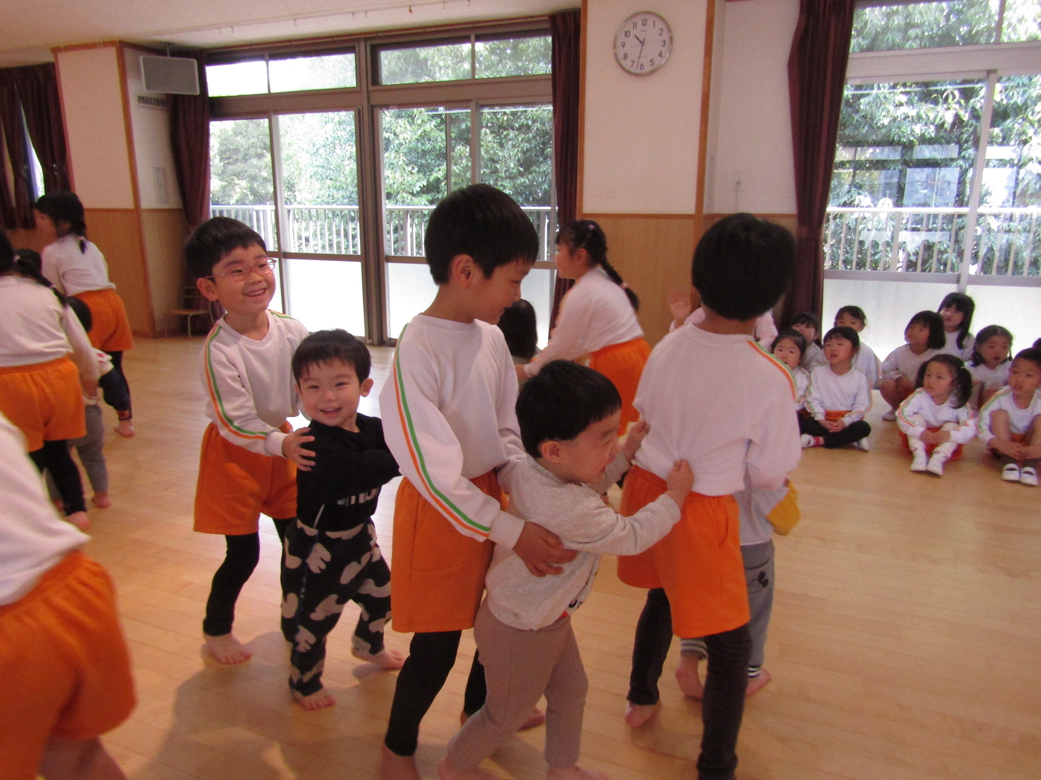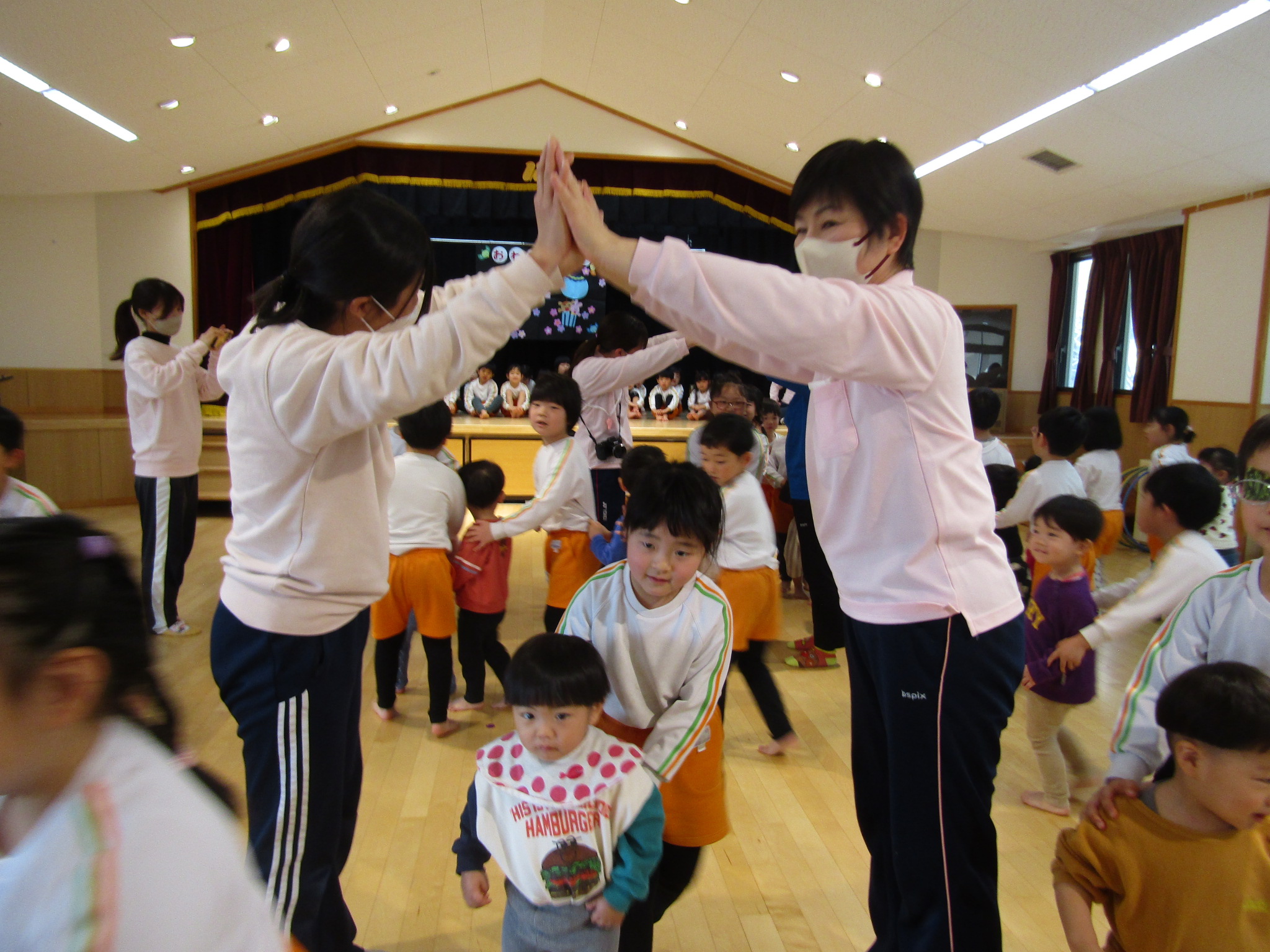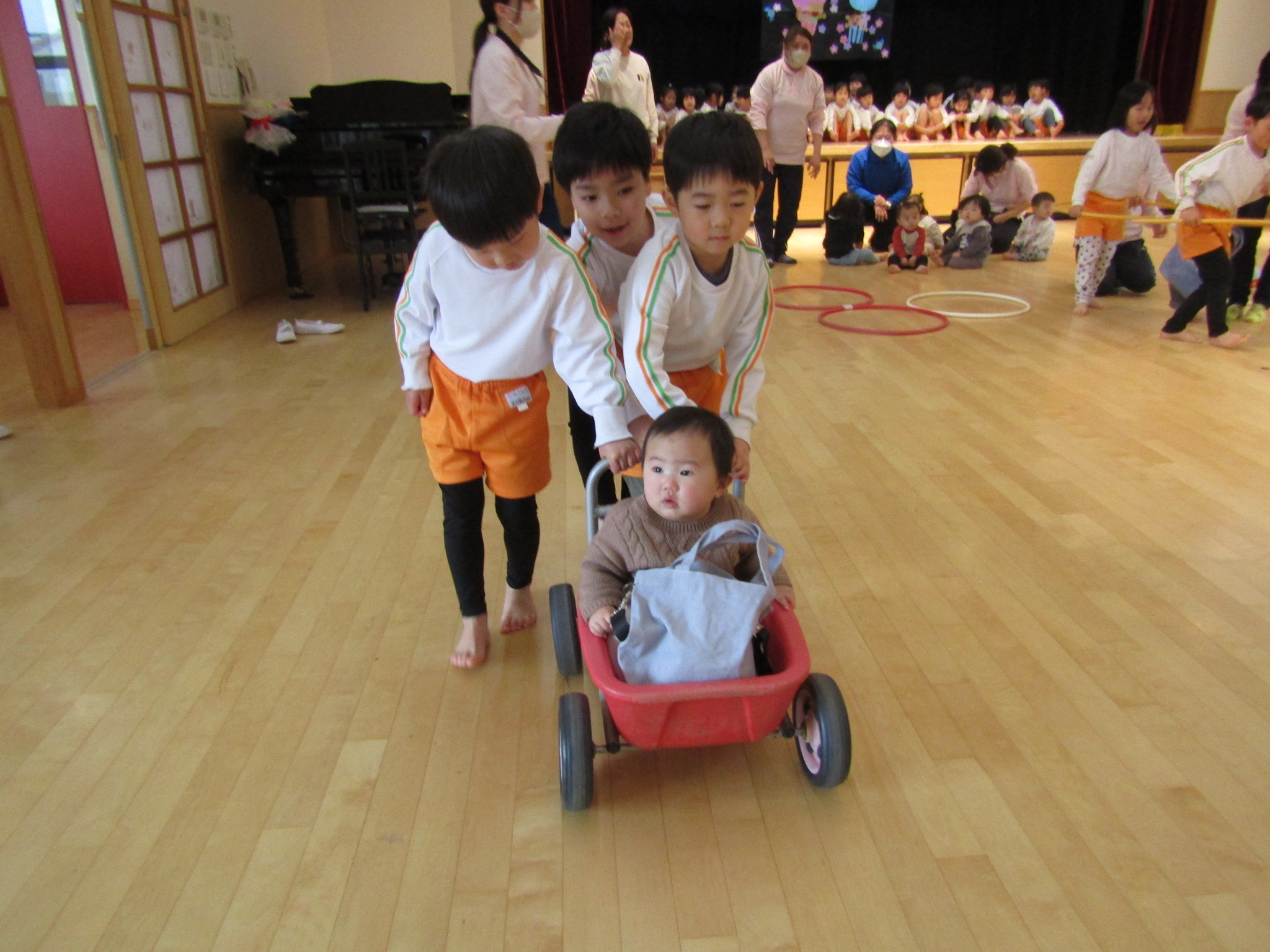 にじぐみのお友達が落ちないようあやめぐみさんが引っ張りました。勢いの良さに大盛り上がり!みんな力持ちでした。