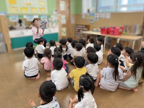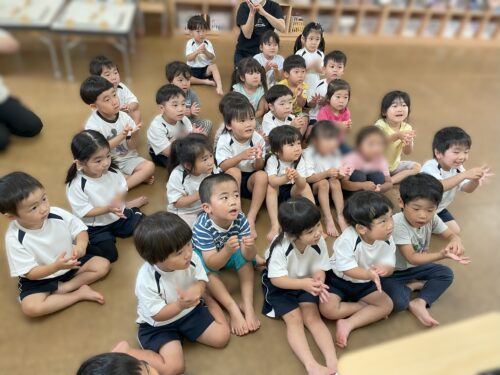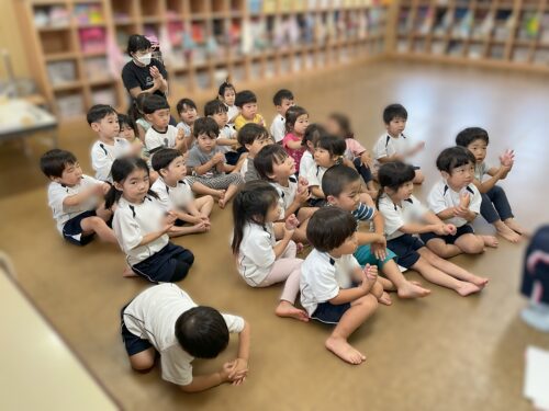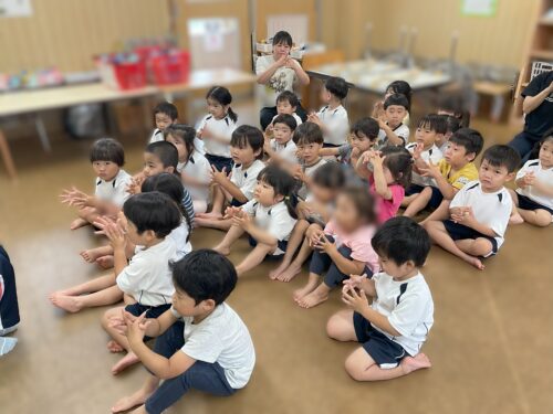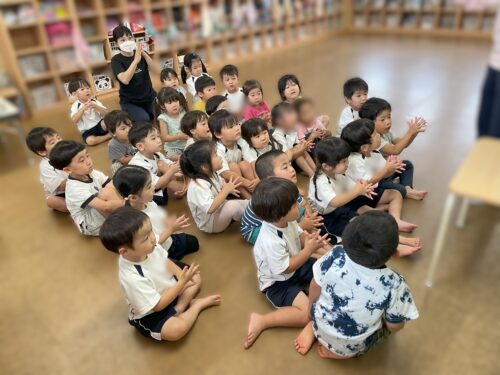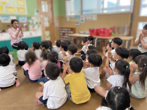 紙芝居が終わったら、看護師に『あわあわ手あらいのうた』の歌詞に合わせて