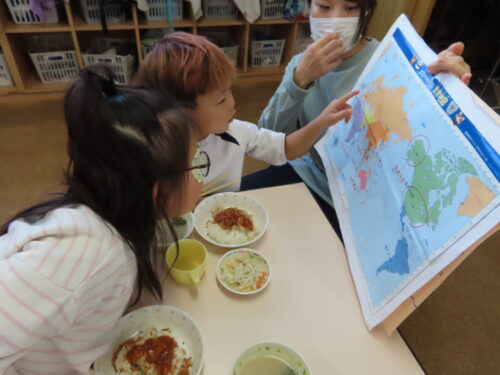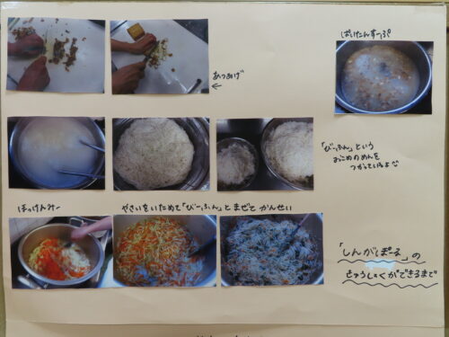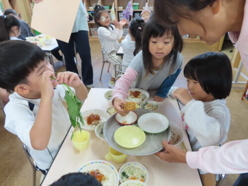 「ビーフンはお米から作られているんだよ」と聞くと、「お米のにおいするかな?」とにおいをかいでいましたよ。