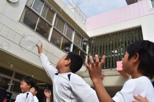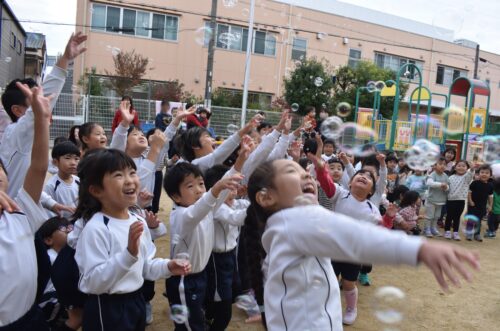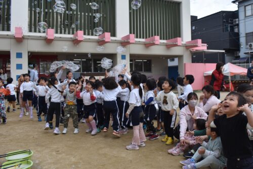 園庭中がシャボン玉と子どもたちの笑顔でいっぱいになりました😄