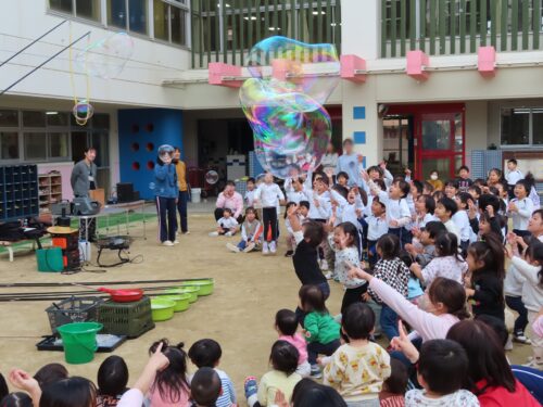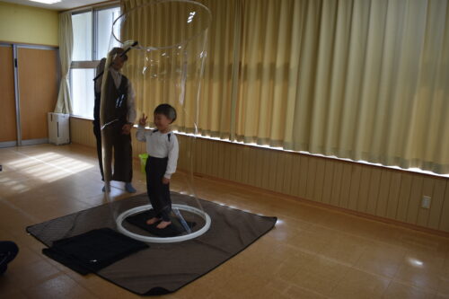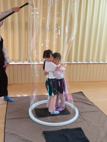 ホールでは2~5歳児のお友達が、シャボン玉の中に入る体験をさせてもらいました。