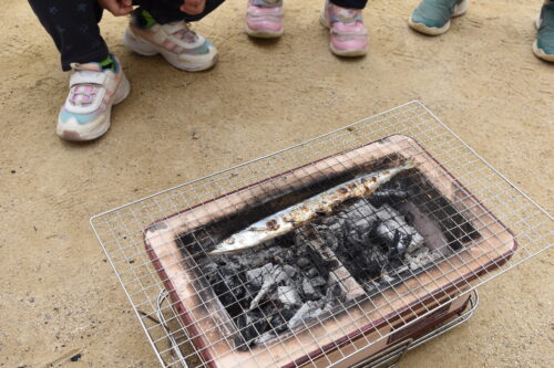 七輪で焼いているさんまをそばで見ます。
