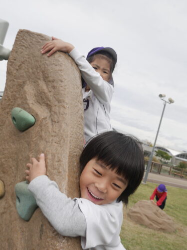 遊具(クライミングウォール)を見つけると「こんな高いところまで登れるで」と