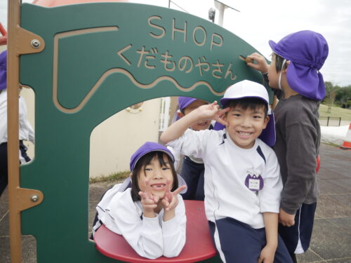 「いらっしゃいませー!」「りんごありますよー」とごっこ遊びが始まりました。