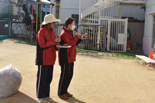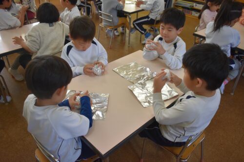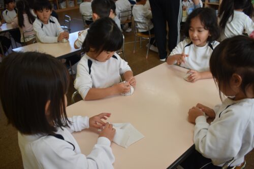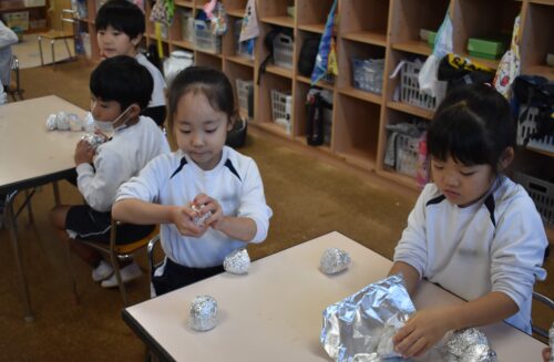 包み終わると園庭に集合です。調理員さんがお芋のお話をしてくれました。