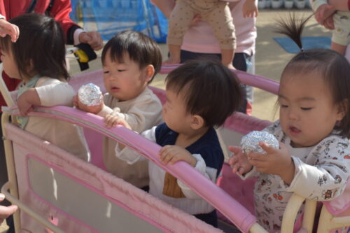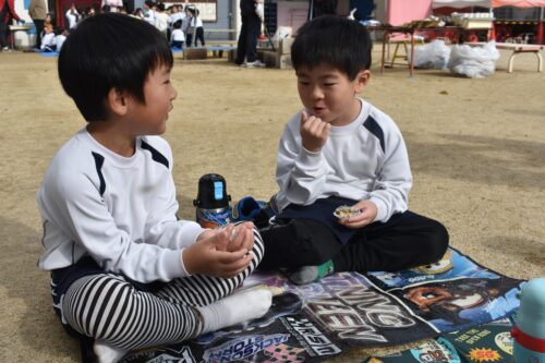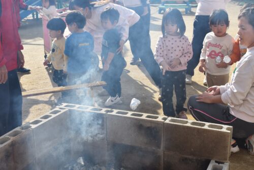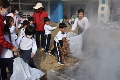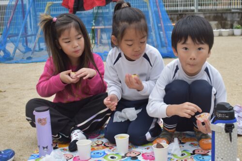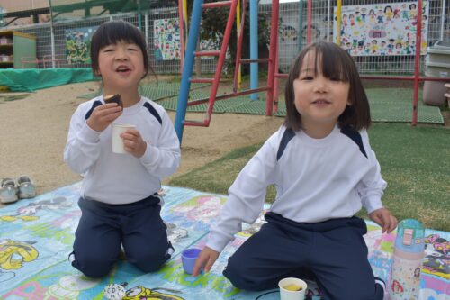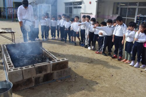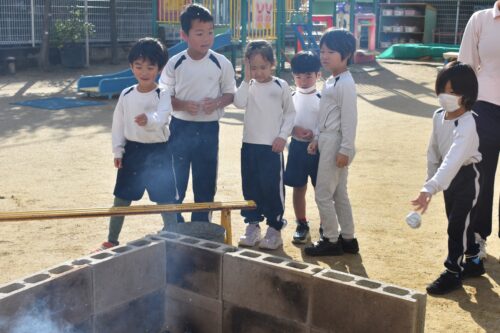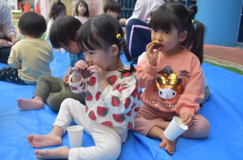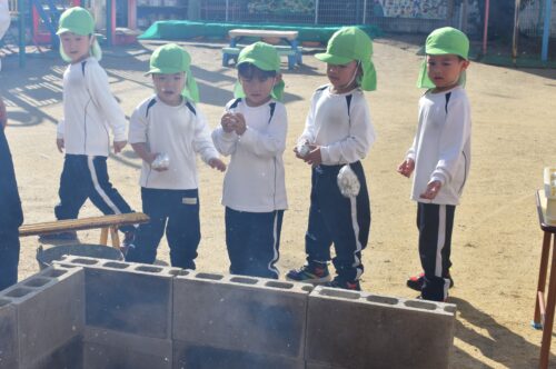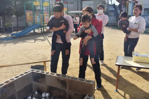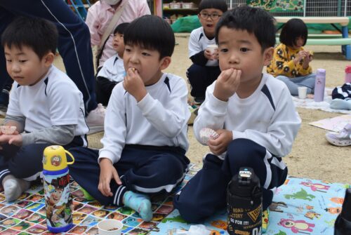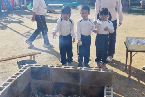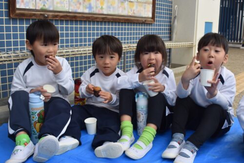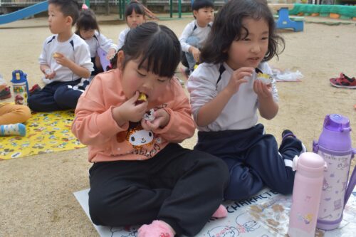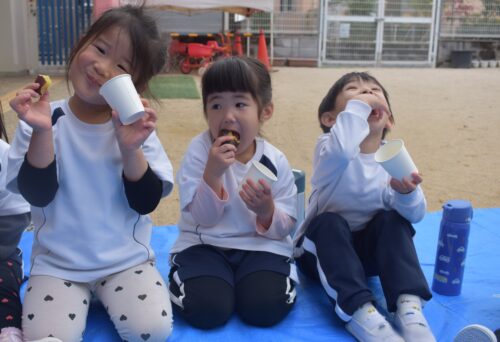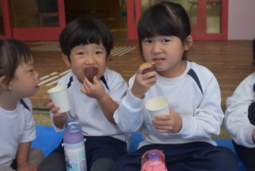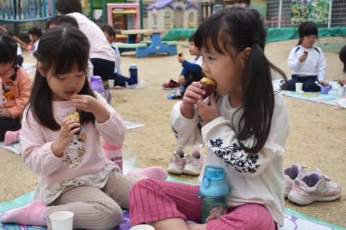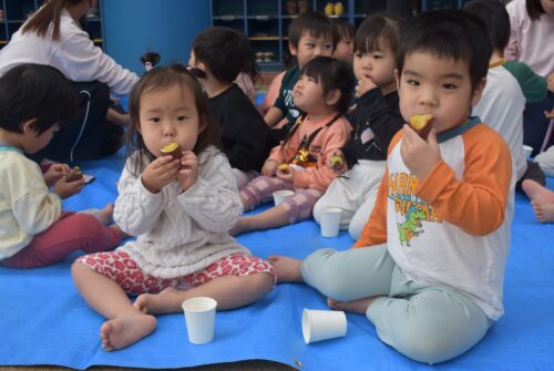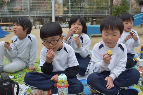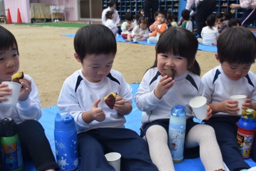 2~5歳児の子どもたちは園庭でお芋を食べました。