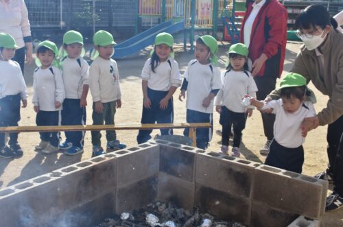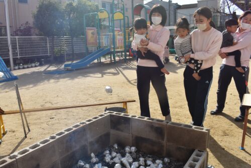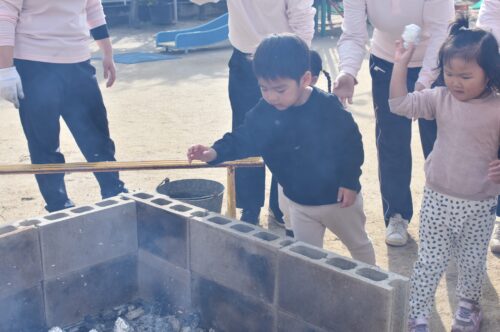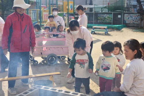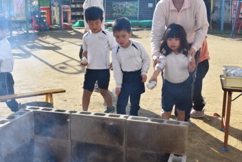 小さいクラスの子どもたちも先生と一緒にお芋を入れました。