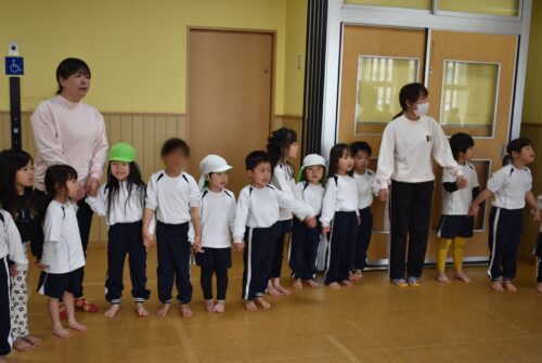 「後ろを向いてください。」と言われ、ぶどう組の子どもたちはドキドキ‼