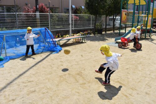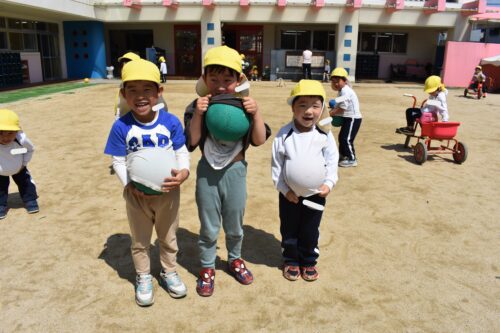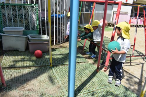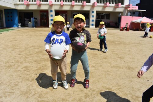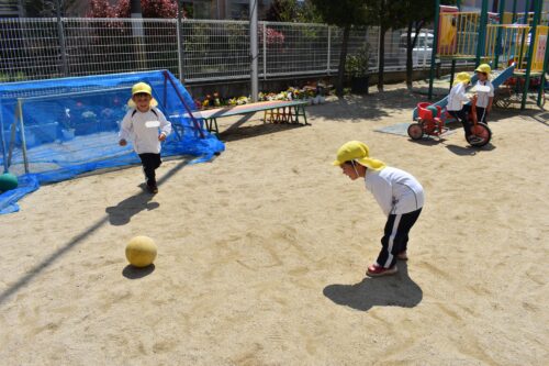 ここでは友達とルールを考え、ボールを投げて自分のところに戻ってきたら勝ち!